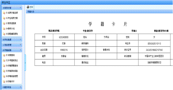 ②在用户界面中点击“学生专区”栏,再选择(D:学籍成绩),然后再点击(08.学籍卡片),在该栏中可以看到学生的学籍信息。