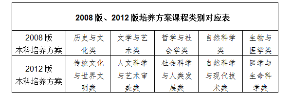 4、原2008版本科培养方案中的历史与文化类、文学与艺术类、哲学与社会学类、自然科学类、生物与医学类五类Ⅱ类通识课,分别对应2012版本科培养方案的传统文化与世界文明类、人文科学与艺术审美类、社会科学与人类发展类、自然科学与现代技术类、医学与生命科学类五类。请各年级学生注意对应关系,以免遗漏相关类别课程。对应表如下: