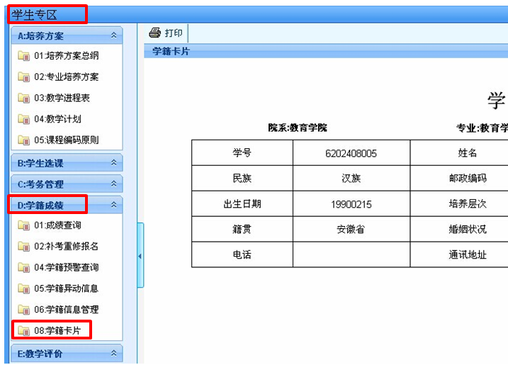 ②在用户界面中点击“学生专区”栏,再选择(D:学籍成绩),然后再点击(08.学籍卡片),在该栏中可以看到学生的学籍信息。