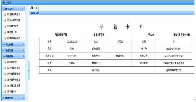 ②在用户界面中点击“学生专区”栏,再选择(D:学籍成绩),然后再点击(08.学籍卡片),在该栏中可以看到学生的学籍信息。
