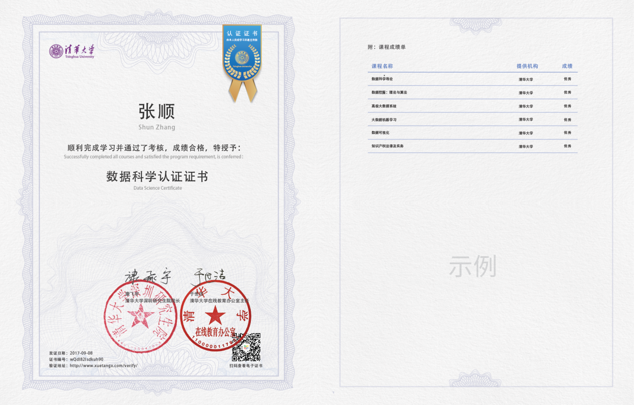 2. 获得6门课程证书后,需参加由指导教师认可的专业实践课并完成报告撰写及通过审核。考核通过后,可申请可获得清华大学深圳研究生院和在线教育办公室共同颁发的认证证书。证书样例如下:
