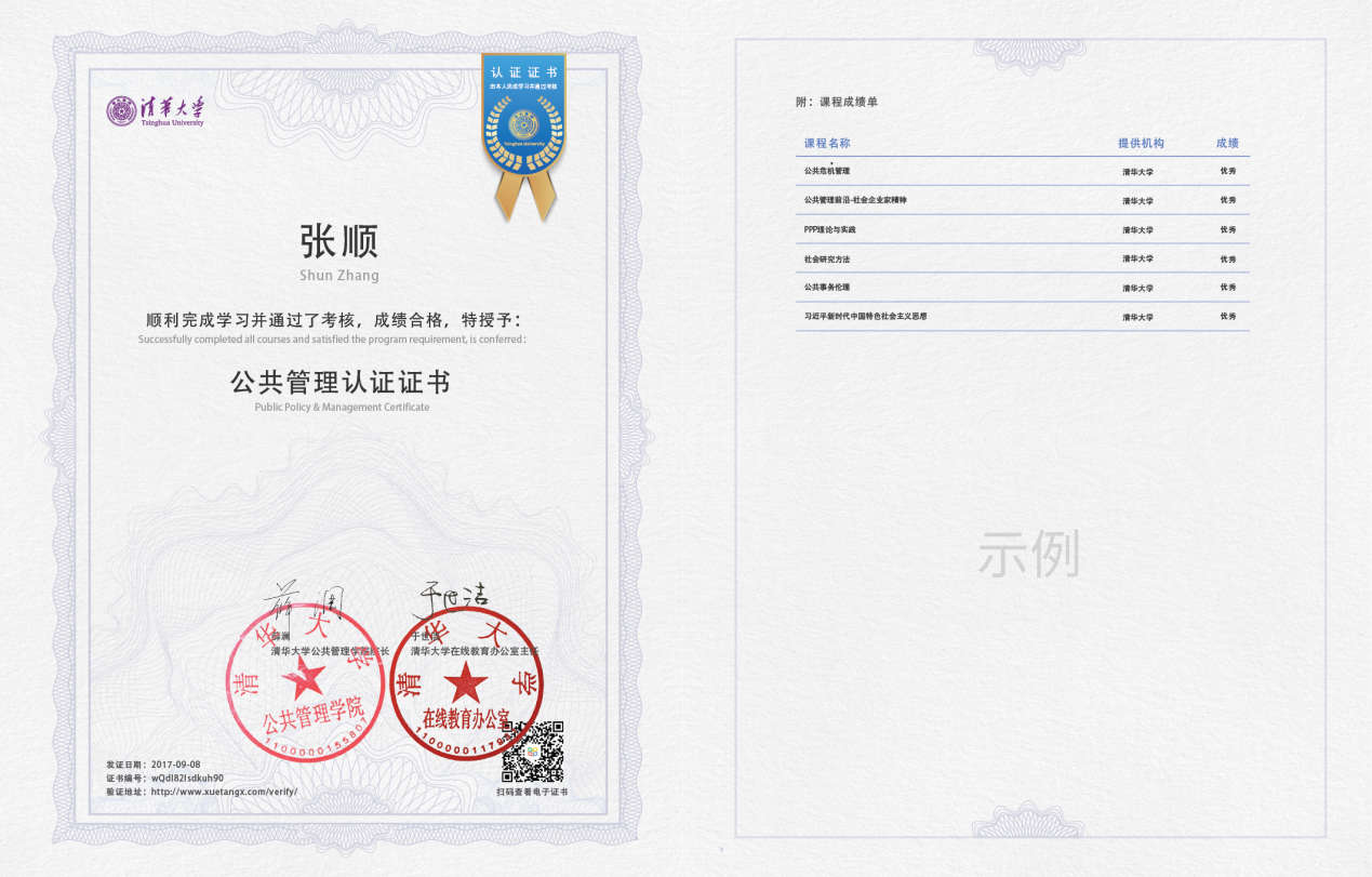 2. 获得6门课程证书后,可获得清华大学公共管理学院和在线教育办公室共同颁发的认证证书。证书样例如下: