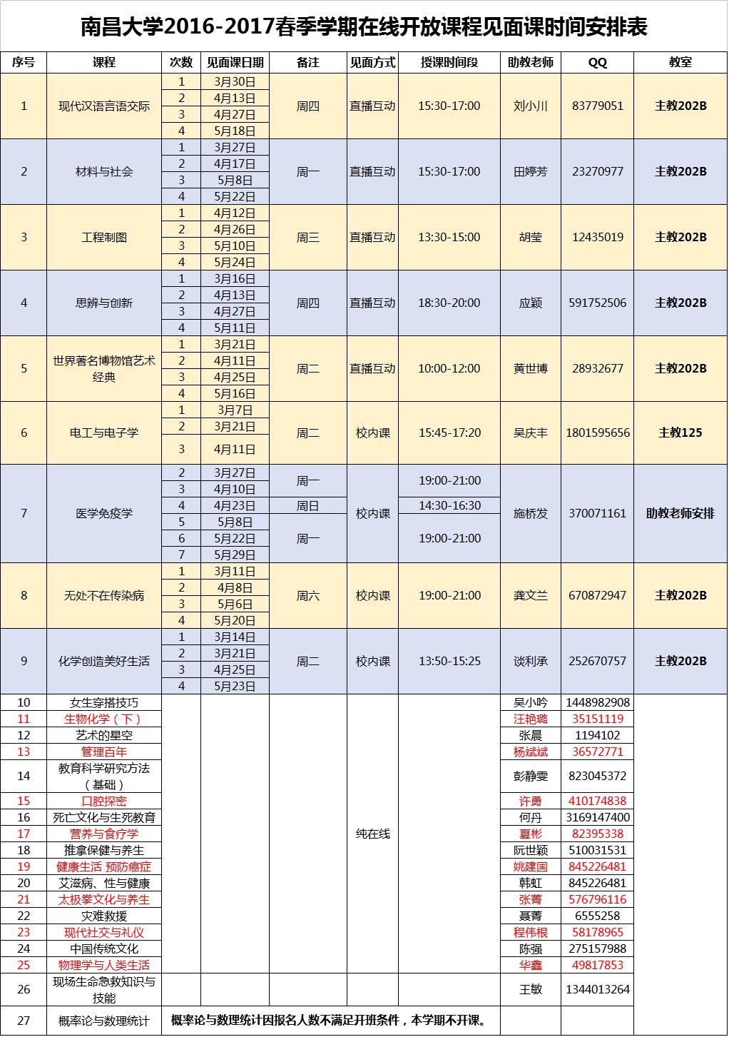 南昌大学2016-2017春季学期在线开放课程见面课时间安排表