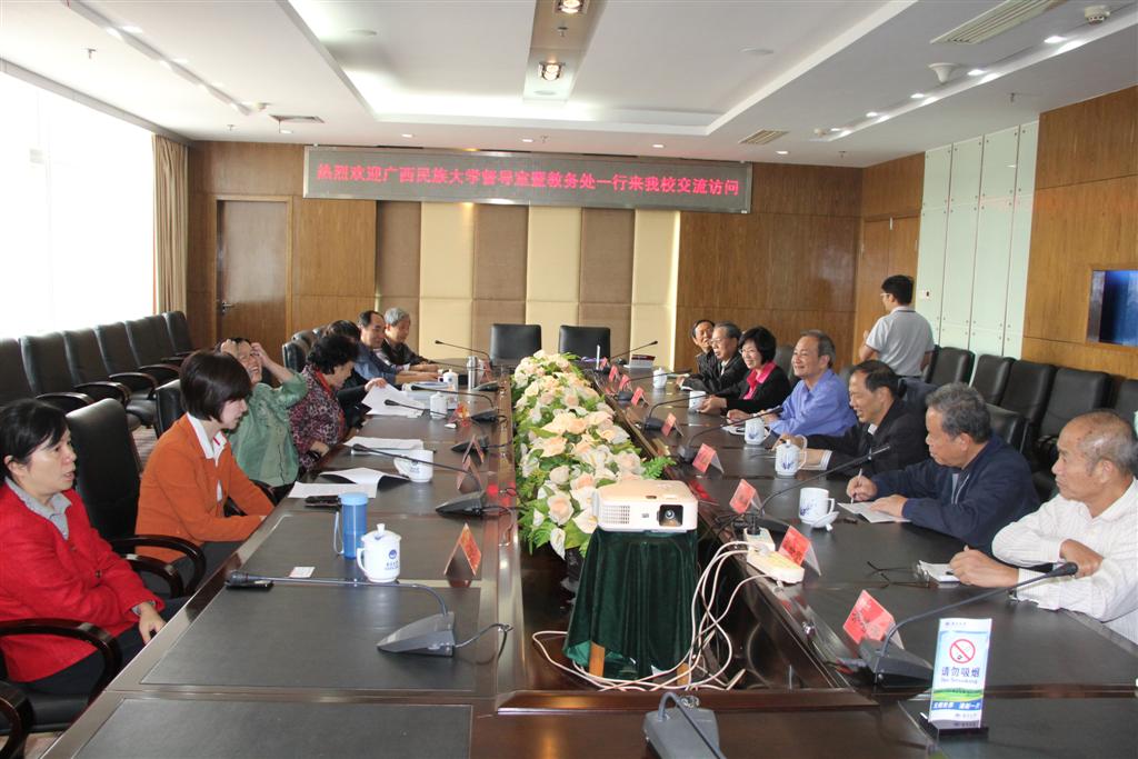 2012年10月17日下午,广西民族大学教务处周桂副处长及教学督导室一行9人来我校考察、交流工作。教务处蔡丹、周勤副处长和督导办曹磊生副主任及各组组长参加了此次交流。
