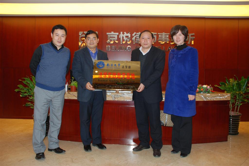 2013年3月7日,南昌大学法学院邓建中副院长和教务处周勤副处长一行专程赴北京,和京悦律师事务所就建设"卓越法律人才"法学实践教学基地进行了友好磋商,并达成合作协议。双方签订协议后,进行了授牌仪式,邓建中副院长代表南昌大学法学院正式授予北京市京悦律师事务所为南昌大学法学实践教学基地。