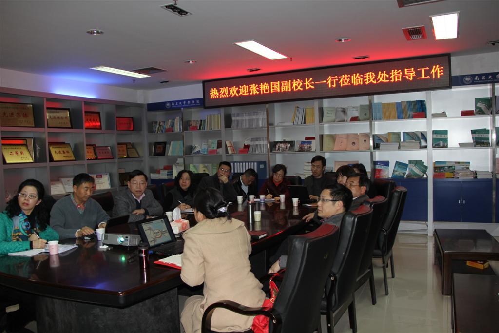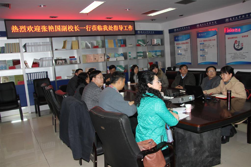 2014年2月26日下午3点30,江西师范大学张艳国副校长一行八人来到教务处进行座谈。座谈会由朱友林副校长主持,教务处主要负责人参加。双方在办公楼101会议室就教学质量监控体系和学院本科教学状态评估进行了交流。
