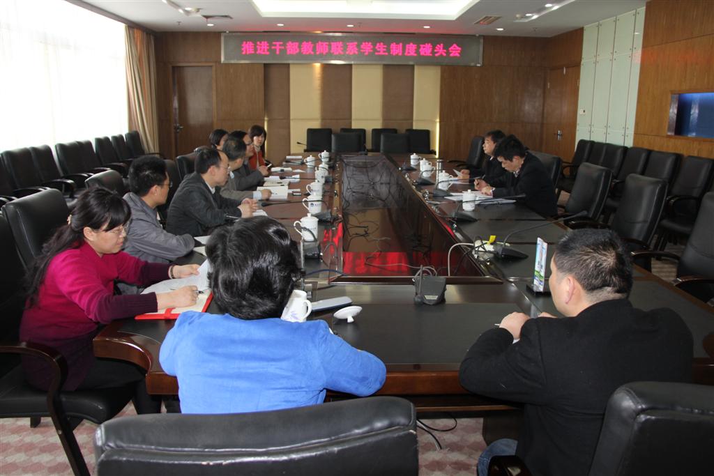 2014年4月2日上午9点,推进干部教师联系学生制度碰头会在第三会议室召开,参加本次会议的有朱友林副校长、李培生校长助理、学工处、团委、教务处和心理健康教育中心的主要负责人。