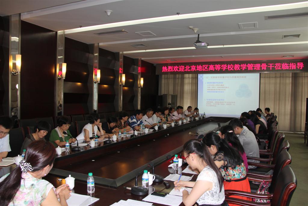 2014年7月14日上午9点,北京联合大学校长助理兼教务处长杨鹏率领中国农业大学、北京航空航天大学、北京交通大学、对外经济贸易大学和外交学院等15所高校教务处一行21人在前湖大厦二楼行政会议室与教务处进行座谈交流,座谈会由张华处长主持,教务处副处长及各科室工作人员参加。