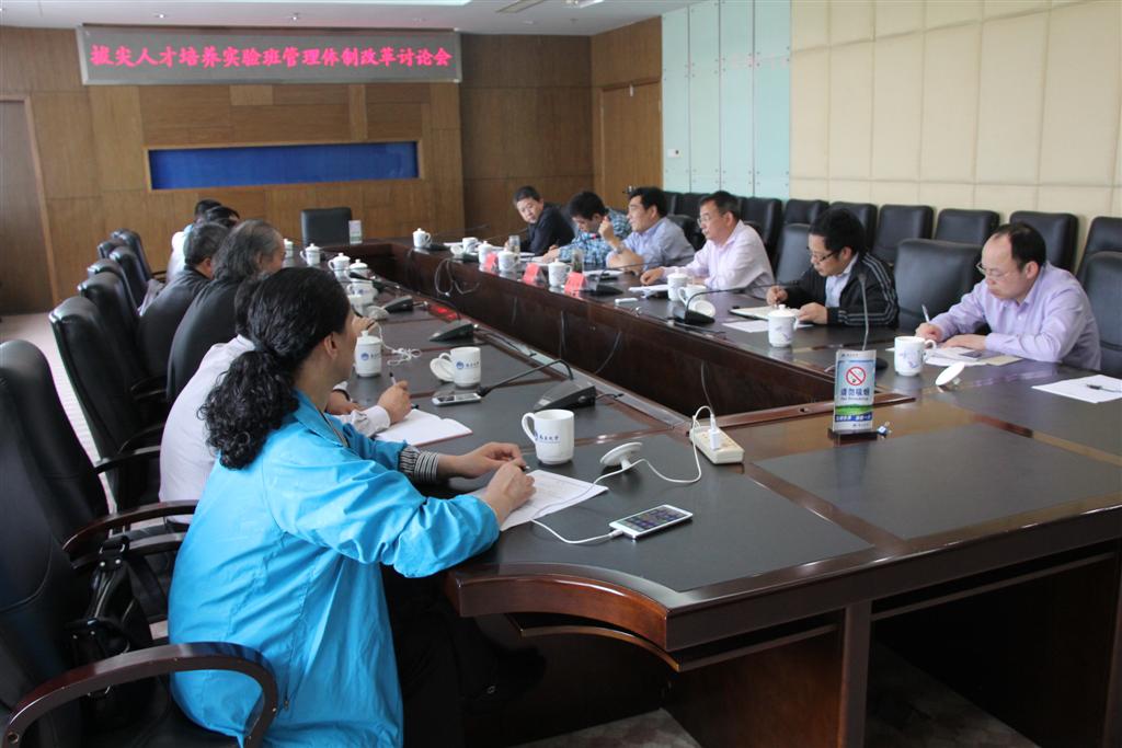 2015年5月5日上午9:30,拔尖人才培养实验班管理体制改革讨论会在办公楼第四会议室召开,会议由教务处张华处长主持,周创兵校长、朱友林副校长、李培生校助出席并讲话,教务处、学工处、前湖学院、高等研究院、国学研究院主要负责人及有关工作人员参加会议。