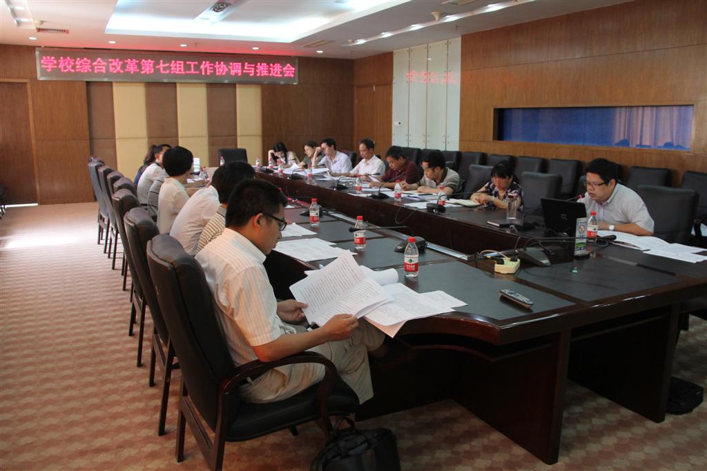 2015年6月17日下午2:30,学校综合改革第七组工作协调与推进会在办公楼第三会议室召开。会议由教务处张华处长主持,朱友林副校长出席会议并讲话,教务处、学工处、团委、国际合作与交流处、教学督导与评估办、国际交流学院、前湖学院、中法中心、中加联合室、中英临床医学等相关负责人参加会议。