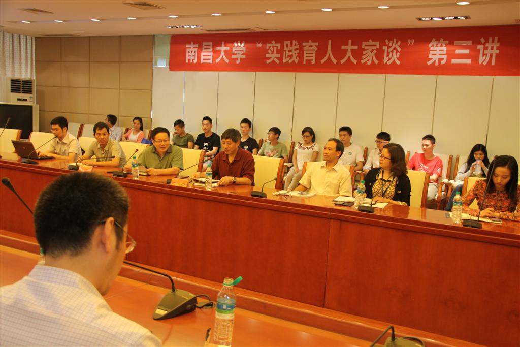 2015年9月14日下午,“实践育人大家谈” 第三讲在教学主楼302会议室开讲,出席讲座的有团委、教务处、学生工作处、招生与就业工作处、科技园和创新创业基地负责人,以及入围首届江西省 “互联网+”大学生创新创业选手。